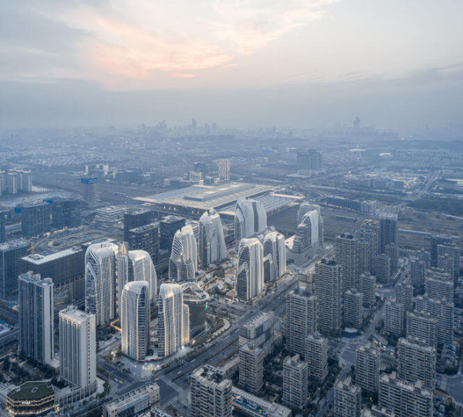 โครงการมิกซ์ยูสเทียบเท่ามหานครขนาดใหญ่ในพื้นที่กว่า 560,000 ตารางเมตร บนใจกลางมณฑลเจียงซูภาคตะวันออกของจีน โครงการประกอบด้วยส่วนที่พักอาศัย อาคารพาณิชย์ โรงแรม สำนักงานและอพาร์ทเมนต์ที่ออกแบบให้ขนานกับเส้นทางรถไฟความเร็วสูง