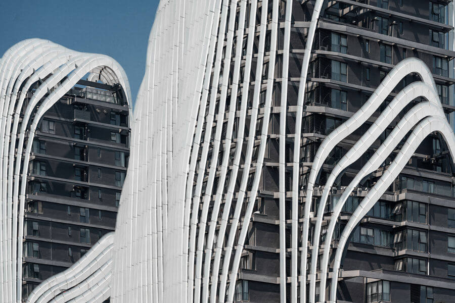 อาคาร 13 แห่งรอบพื้นที่ โครงสร้างออกแบบให้เสมือนภูเขาที่ก่อร่างจากลมและน้ำ มีแนวสันและวงโค้งจากช่องกระจกที่ลดหลั่นกันไม่ต่างจากชั้นน้ำตก ให้บรรยากาศของภูเขาและแม่น้ำที่คดเคี้ยวอยู่โดยรอบ ซึ่งในพื้นที่จริงจะใช้สระน้ำและน้ำตกเชื่อมต่อระหว่างอาคาร ขณะที่ใช้ต้นไม้และพืชพรรณช่วยผสานระหว่างสภาพแวดล้อมจริงและที่สร้างขึ้นใหม่ นอกจากนี้การเปิดพื้นที่โล่งยังเพิ่มแสงและระบบไหลเวียนอากาศที่ดียิ่งช่วยสร้างความรู้สึกสงบท่ามกลางเมืองใหญ่ โดยหากมองจากระยะไกลกลุ่มอาคารไม่ต่างจากทิวเขาที่โอบล้อมพื้นที่สาธารณะซึ่งเปรียบได้กับหมู่บ้านที่ผู้พักอาศัยสามารถเชื่อมต่อกับธรรมชาติได้โดยตรง
